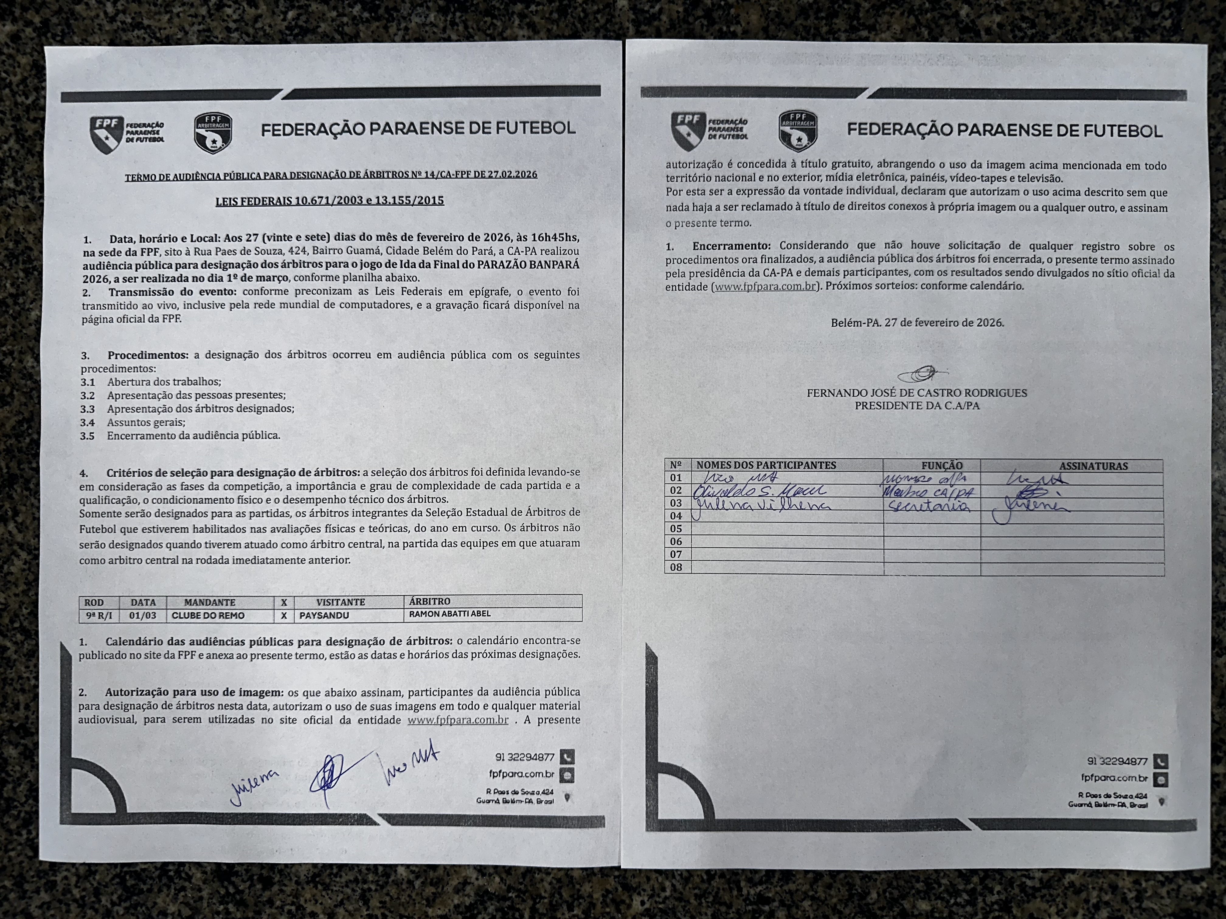 A Comissão de Arbitragem da Federação Paraense de Futebol, designou na tarde desta sexta-feira (27/02), os árbitros para a final do Parazão Banpará 2026, conforme planilha a seguir: