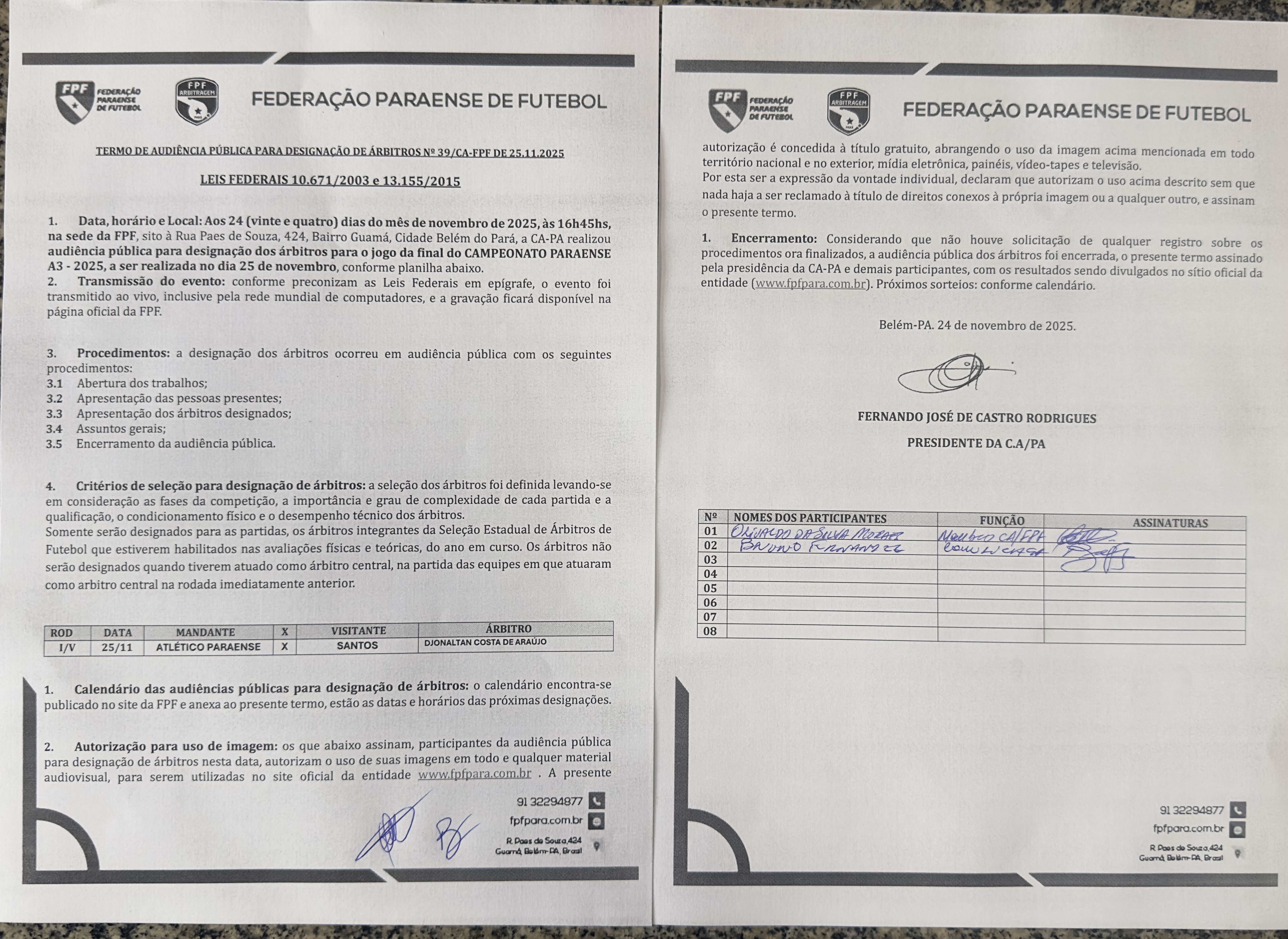 A Comissão de Arbitragem da Federação Paraense de Futebol, designou na tarde desta segunda-feira (24/11), os árbitros para a FINAL do Campeonato Paraense A3 Banpará 2025, conforme planilha a seguir: